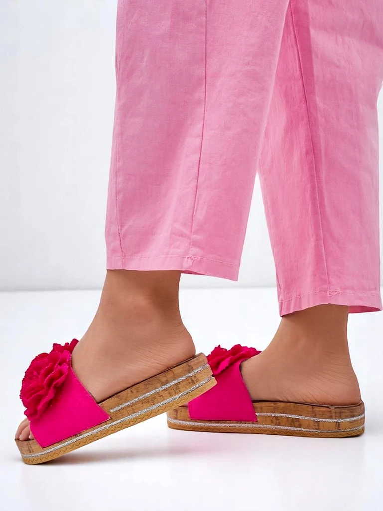 • Красивые женские ш slippers из искусственной замши, декорированные цветами. Резиновая подошва, украшенная материалом, напоминающим пробку, и стразами. Модель в интересной цветовой гамме. Отлично дополняет летние наряды!