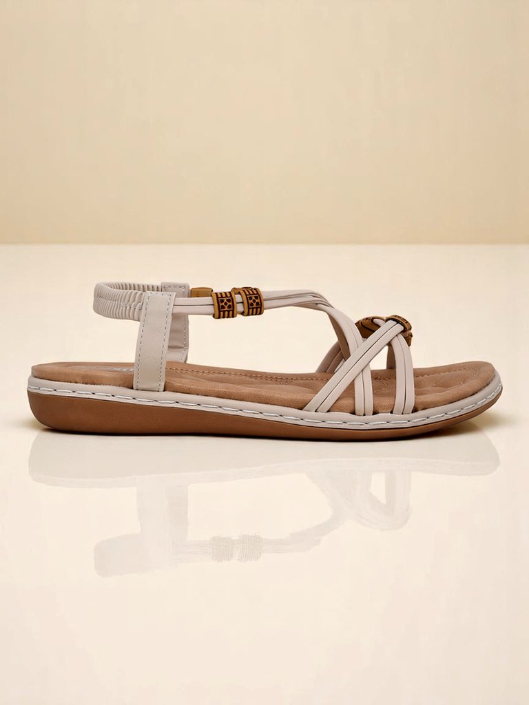 • Женские сандалии на плоской подошве - идеальный вариант для жарких летних дней. Ремешки выполнены из приятной искусственной кожи. Передняя часть украшена элегантными плетеными ремешками и украшениями из бусин. Обувь без застежек.