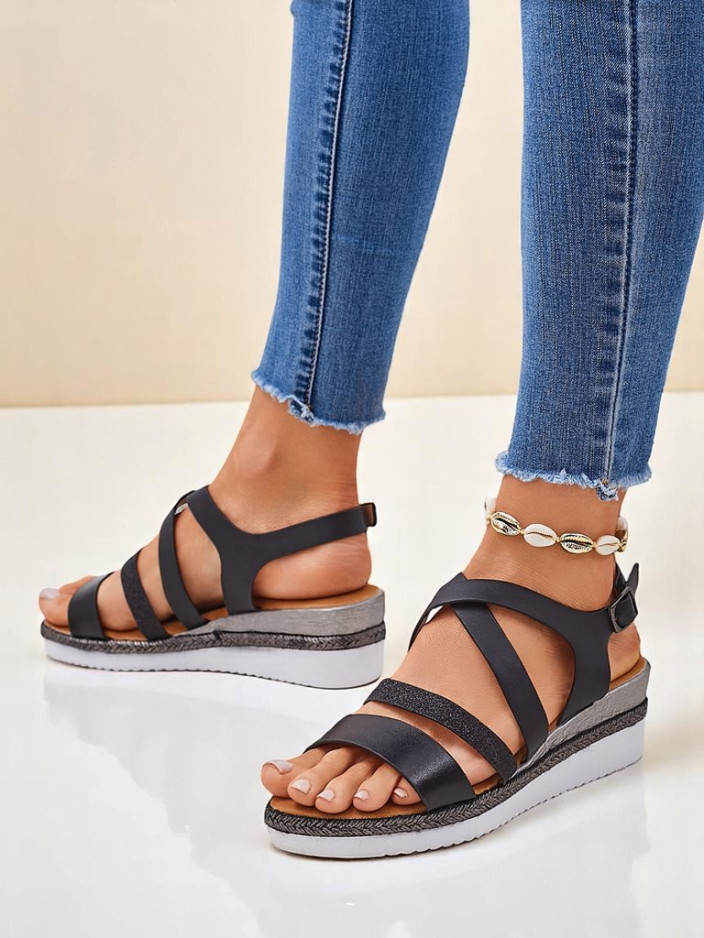 • Эффектные женские сандалии на танкетке, украшенные нежным блеском, идеально подчеркивают летнее сияние. Сочетание комфорта и роскошного внешнего вида – идеально подходит для любого особого случая!