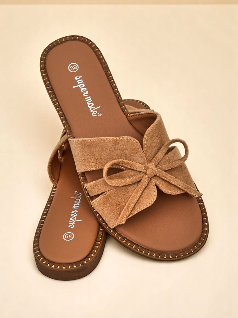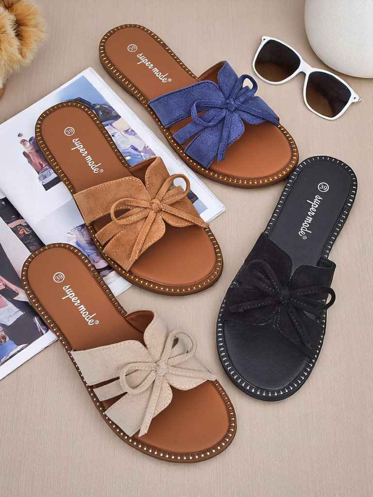 - Прекрасные женские тапочки на плоской подошве. Изготовлены из экологически чистой искусственной замши. Украшены бантом на верхней части. Идеальный выбор для повседневной носки!