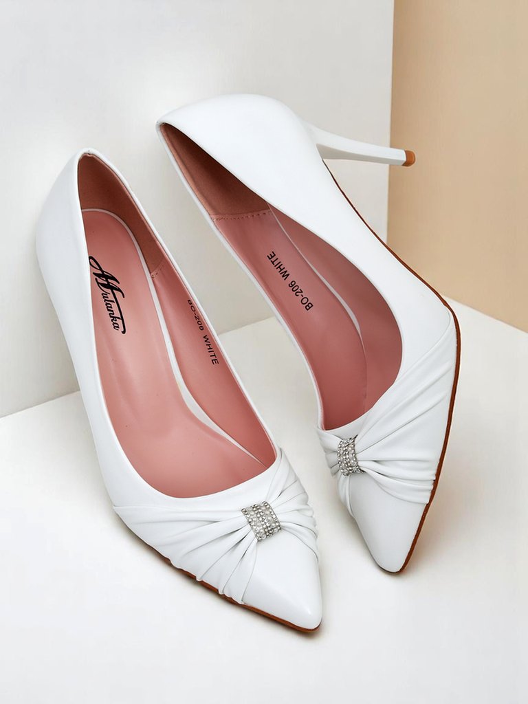 • Женские туфли-лодочки из экокожи на шпильке с заостренным носком. Украшены сборками и стразами, сочетают элегантность с легким блеском, идеально подходят для особых случаев.