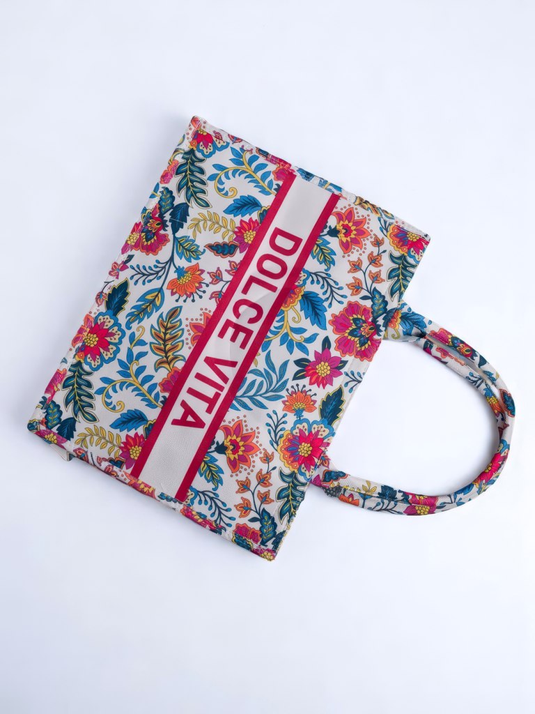 - Большая женская тканевая сумка с ярким узорчатым мотивом и надписью DOLCE VITA. Одно отделение, легкая и вместительная — идеально подходит для лета и стильных выходов!
