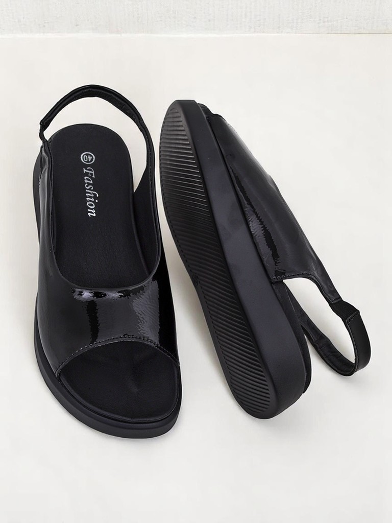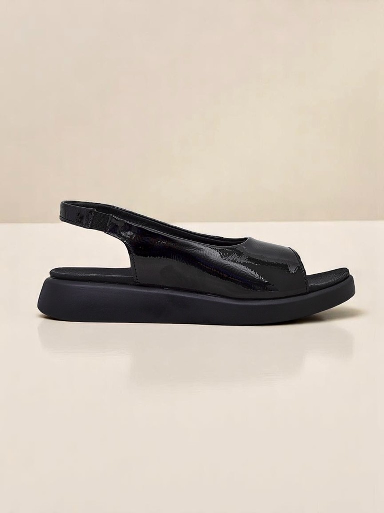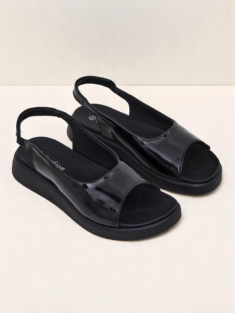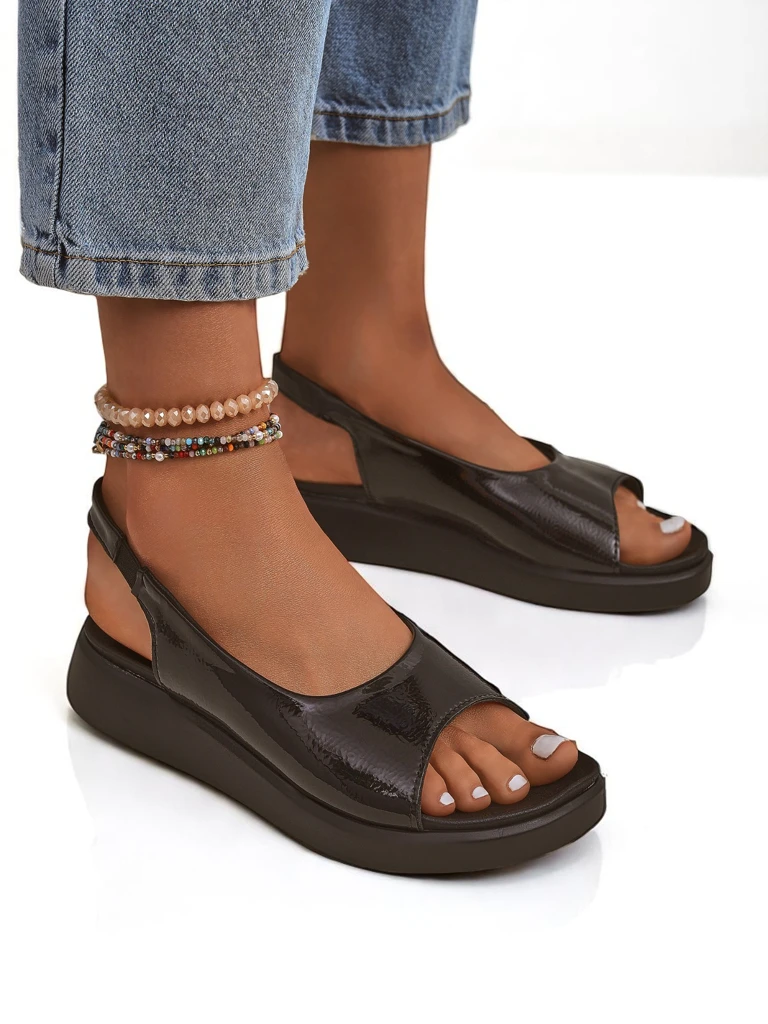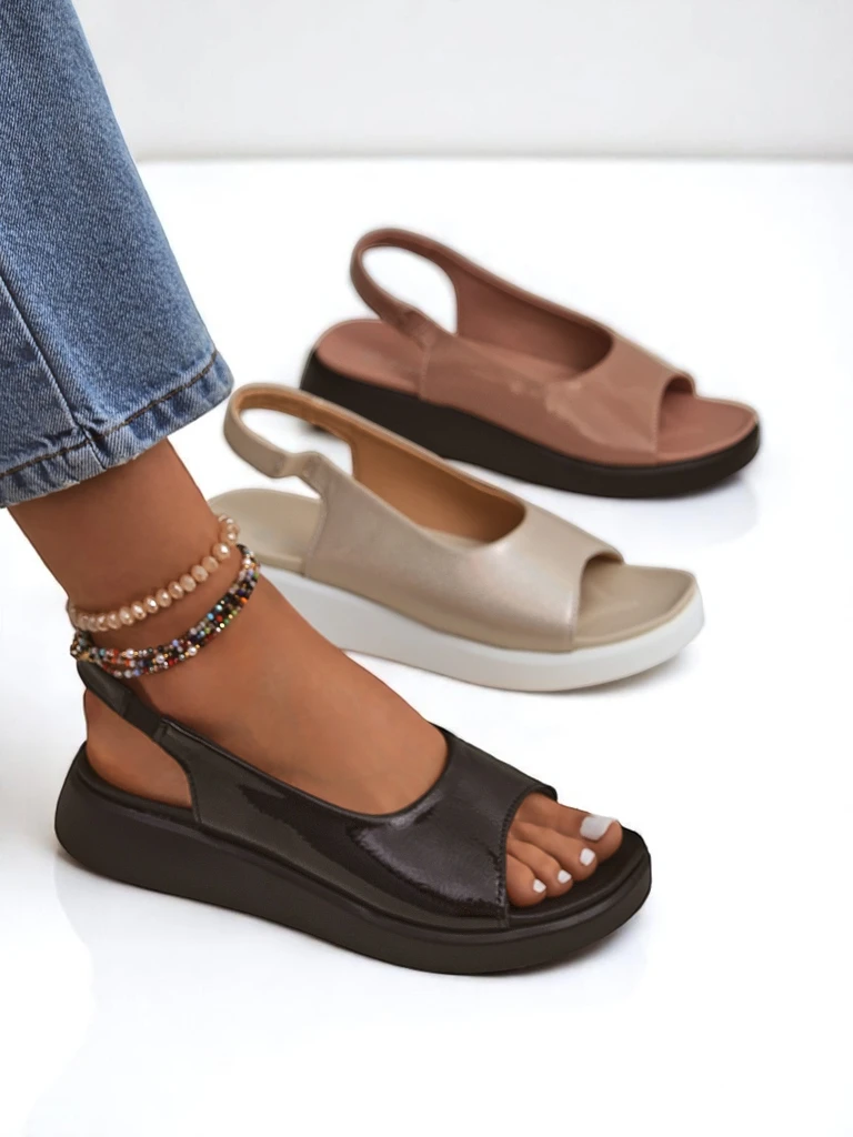 - Стильные сандалии на толстой подошве из блестящей экокожи. Модель без застежки сочетает в себе удобство и современный вид – идеально подходит для летних дней и вечеров.