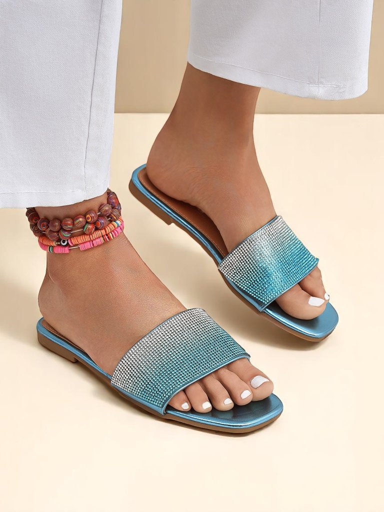 - Плоские женские шлепанцы из экокожи, украшенные цирконами и эффектом омбре. Стильные, блестящие и удобные – идеально подходят для лета, добавят блеска любому образу.