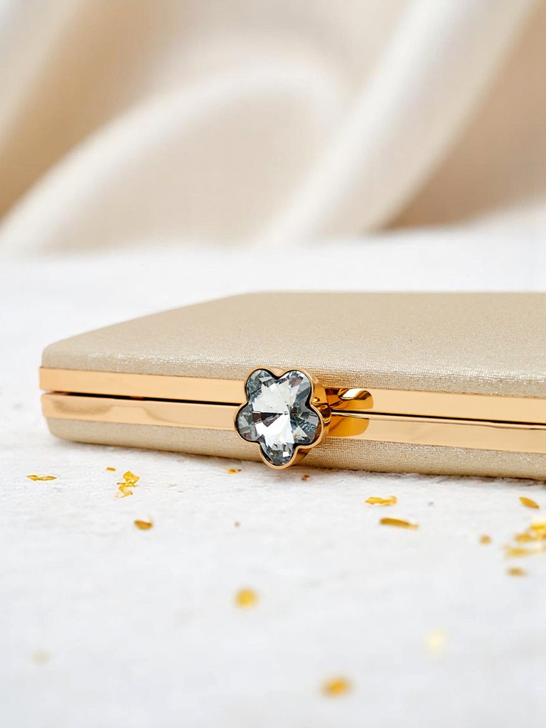 • Элегантный клатч из экокожи, покрытый тканью с блестящей нитью и изысканным тиснением. Застегивается на кнопку, со съемной цепочкой — блеск для любого случая.