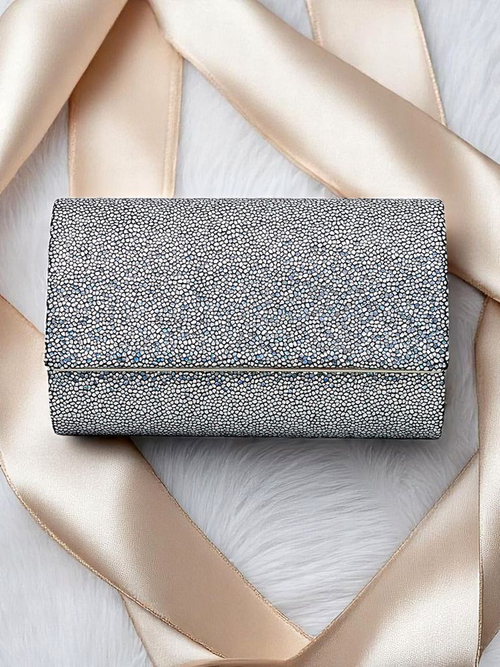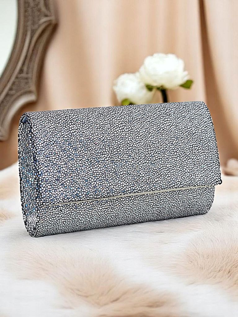 - Стильный клатч из экокожи, покрытый плотной блестящей тканью. Застегивается на магнит, с съемным ремешком — идеально подходит для вечерних выходов и особых случаев.