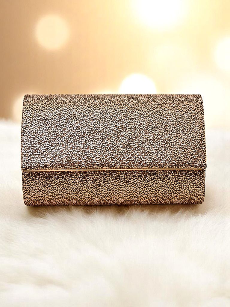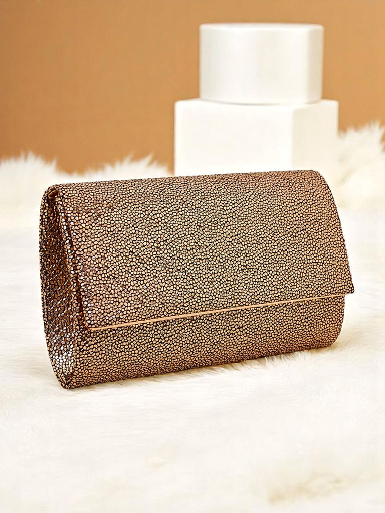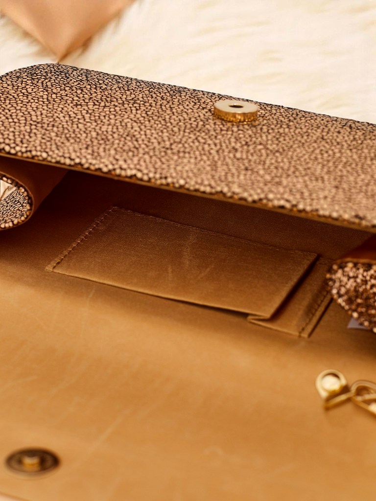 • Стильный клатч из экокожи, покрытый плотной блестящей тканью. Застегивается на магнит, с съемным ремешком — идеально подходит для вечерних выходов и особых случаев.