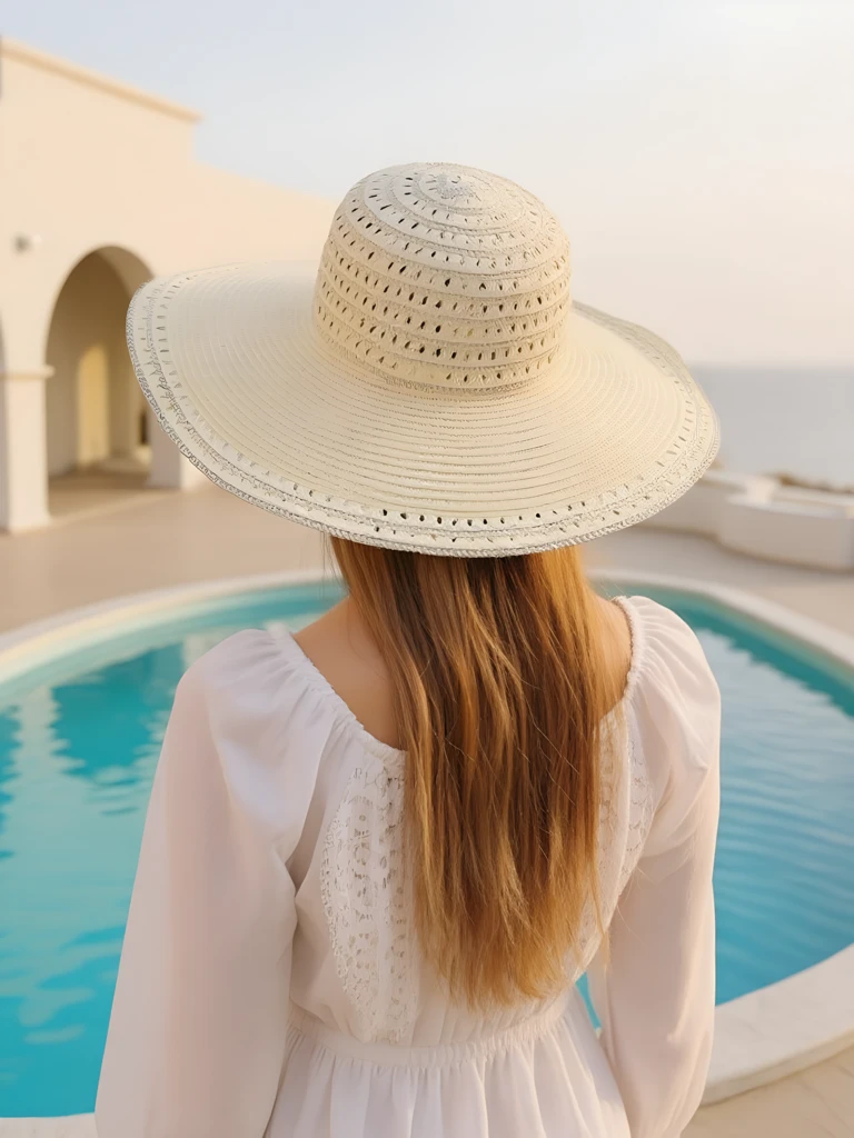 - Соломенная шляпа с широкими полями, переплетённая с блестящей нитью. Лёгкое сияние придаёт элегантности, а лёгкая конструкция обеспечивает стильную защиту в солнечные дни.