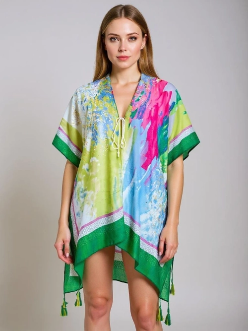 • Летняя пляжная туника-парео с V-образным вырезом и асимметричным низом – стильный must-have для отпуска. Легкая, воздушная ткань и эффектный узор подчеркивают женственность, а свободный крой обеспечивает комфорт в жаркие дни. Идеально подходит для пляжа и