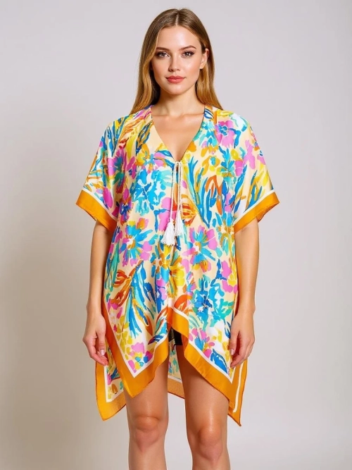 • Летняя пляжная туника-парео с V-образным вырезом и асимметричным низом – стильный must-have для отпуска. Легкая, воздушная ткань и эффектный узор подчеркивают женственность, а свободный крой обеспечивает комфорт в жаркие дни. Идеально подходит для пляжа и