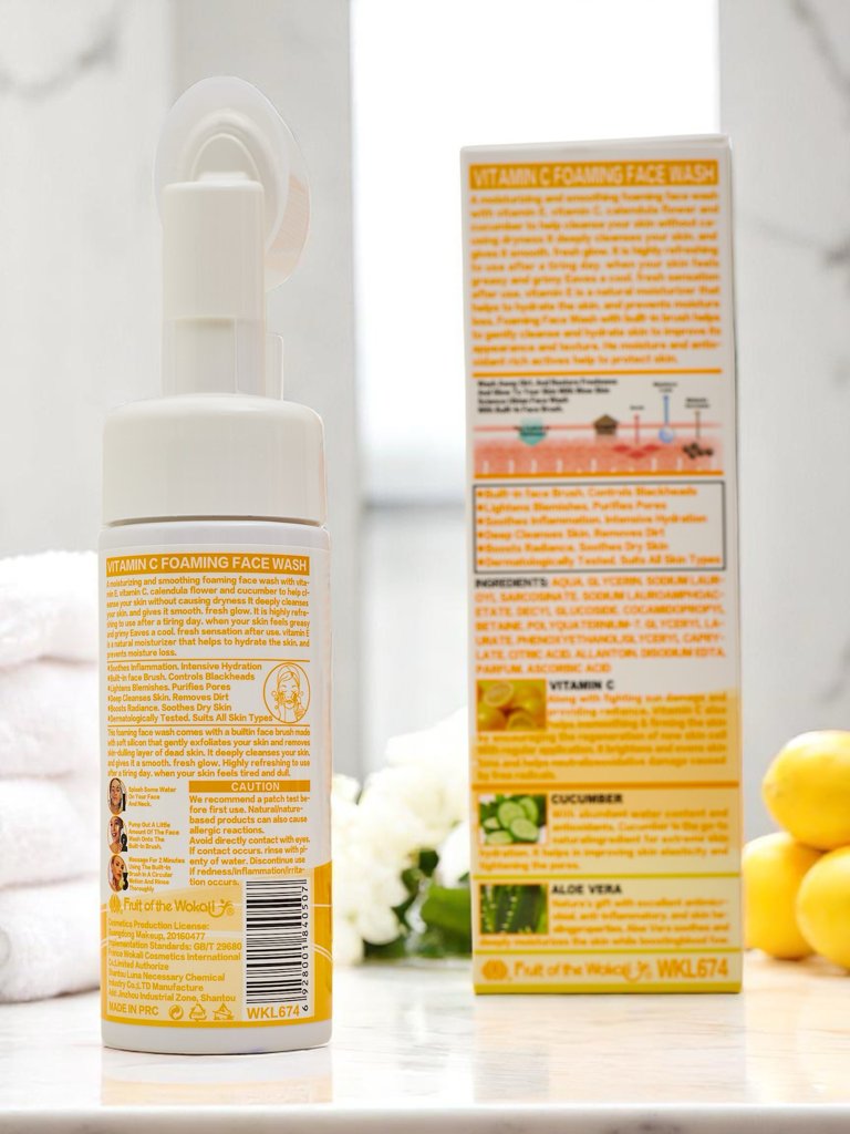 - Очищающая пенка для лица с витамином C и щеткой. Мягко удаляет загрязнения, осветляет кожу и обладает антивозрастными свойствами, делая цвет лица свежим, гладким и сияющим.
