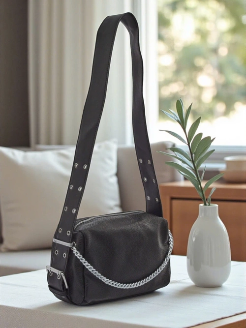 - Небольшая женская сумка из экокожи с одним основным отделением на молнии. Стильный широкий ремень обеспечивает удобство при ношении, а декоративная цепочка придаёт элегантность. Идеально подходит для повседневного использования и вечерних выходов – лёгкая