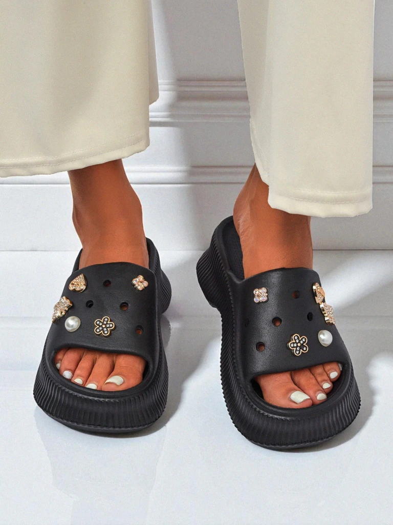 - Стильные женские шлепанцы с украшениями на утолщенной резиновой подошве сочетают комфорт и модный вид. Идеальны для лета — легкие, прочные и привлекающие внимание деталями. Отлично подойдут для пляжа, города и ежедневных прогулок.