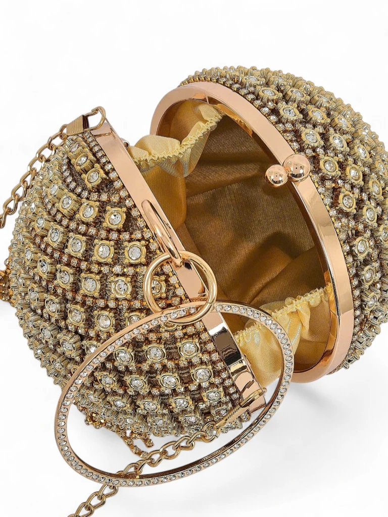 • Круглая сумочка-клатч с блестящими цирконами и элегантной цепочкой на плечо. Идеально подходит для вечерних выходов — привлекает взгляды и дополняет любой образ.