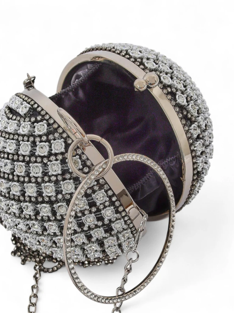 • Круглая сумочка-клатч с блестящими цирконами и элегантной цепочкой на плечо. Идеально подходит для вечерних выходов — привлекает взгляды и дополняет любой образ.