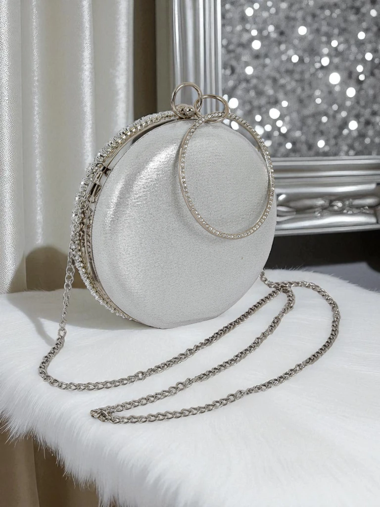 - Круглый клатч с замысловато украшенной цирконами поверхностью. Цепочка позволяет носить его на плече. Элегантный, выразительный и созданный, чтобы сиять в темноте.