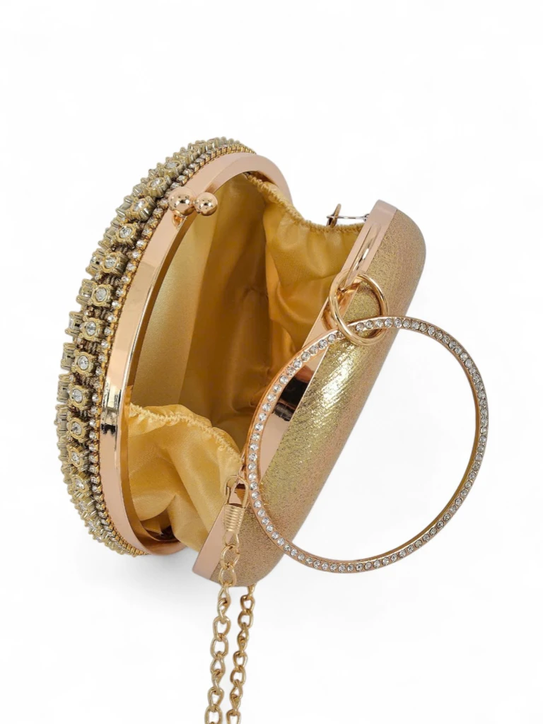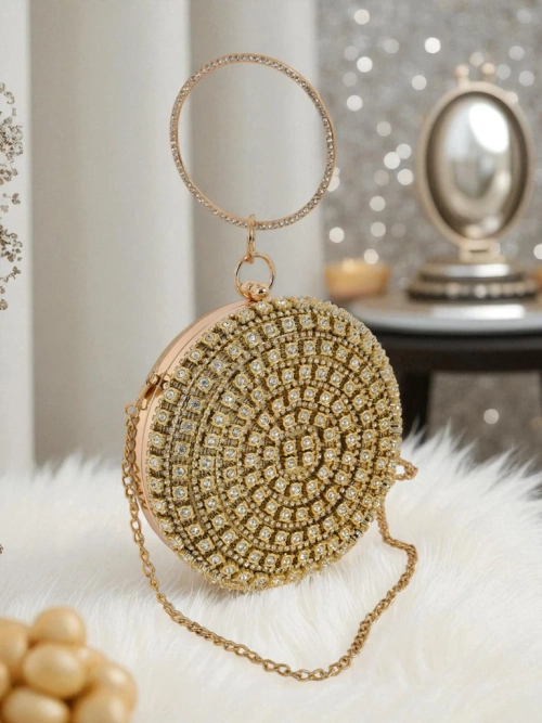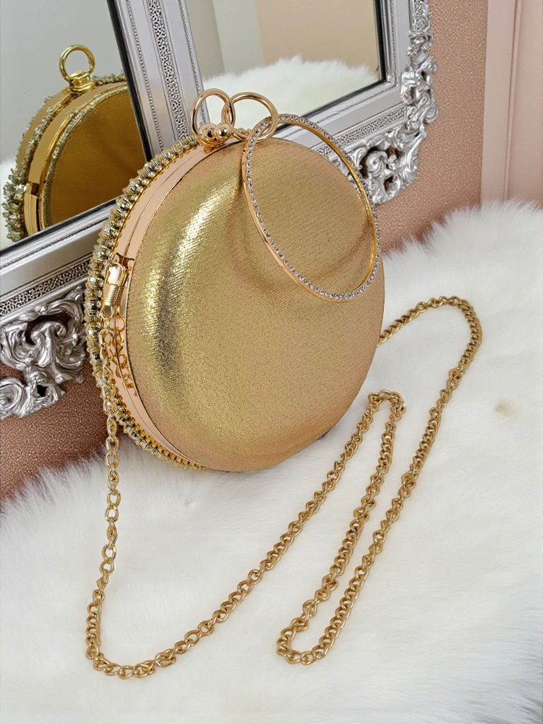 • Круглый клатч с замысловато украшенной цирконами поверхностью. Цепочка позволяет носить его на плече. Элегантный, выразительный и созданный, чтобы сиять в темноте.