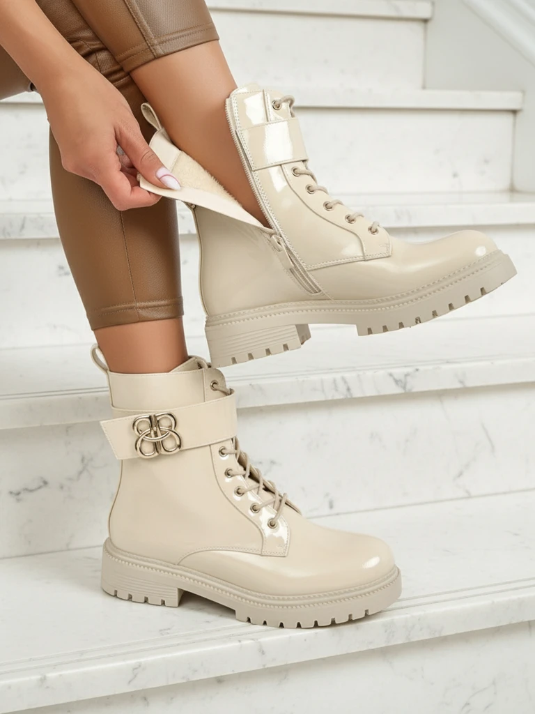 Стильные ботинки Ariadne – это уникальное предложение для женщин, которые ценят сочетание комфорта, современного дизайна и заботы об окружающей среде. Изготовленные из высококачественной экологической кожи, они являются отличной альтернативой традиционным кожаным изделиям. Этот материал получен с использованием современных экологически чистых технологий и не тестировался на животных. Экокожа, покрытая прочным полиуретановым покрытием, гарантирует устойчивость к царапинам и влаге, обеспечивая комфортное использование в течение всего осенне-зимнего сезона.Бежевый цвет ботинок Ariadne – это синоним универсальности – он идеально вписывается в актуальные минималистичные тенденции и нейтральные цвета, которые доминируют в моде уже несколько сезонов. Квадратная золотистая пряжка на ремешке добавляет изысканности и является тонким ювелирным акцентом. Модель имеет практичную застежку-молнию и удобную шнуровку, что облегчает быстрое надевание и подгонку по ноге.Ботинки Ariadne отлично смотрятся в классических и повседневных образах. Вы можете сочетать их с:1. Узкими джинсами и свитером оверсайз – идеальный комплект для повседневных прогулок по городу.2. Элегантной юбкой миди и водолазкой – вы создадите модный образ для офиса или встречи с друзьями.3. Кожаной курткой-косухой и контрастным платьем – отсылка к городскому уличному стилю в женственном исполнении.Благодаря прочной рифленой подошве и мягкой внутренней отделке, обувь устойчива и удобна даже во время длительных прогулок. Круглый носок обеспечивает комфорт для пальцев и не стесняет движений, а профилированный каблук приподнимает силуэт, не перегружая ноги.Способ ухода: Рекомендуется регулярно протирать обувь мягкой, слегка влажной тканью и использовать специальные средства по уходу за экокожей. Храните ботинки в проветриваемом месте, желательно в оригинальной коробке или мешочках, чтобы избежать деформации. Избегайте хранения под прямыми солнечными лучами и вблизи источников тепла.Ботинки Ariadne идеально вписываются в современную моду на приглушенные цвета, массивные подошвы и тонкие ювелирные детали. Они станут отличным дополнением как к повседневным, так и к более изысканным образам, позволяя каждой женщине чувствовать себя модно и комфортно.