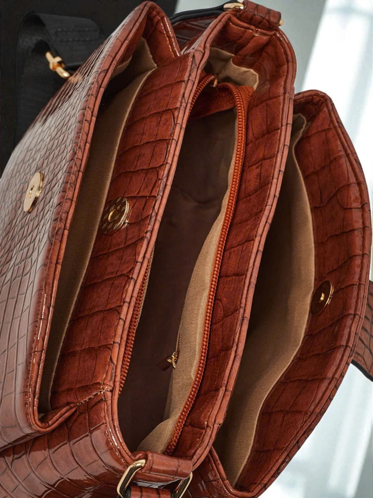 - Квадратная сумочка из лакированной экокожи с тиснением. 1 отделение, 3 кармашка, замок, магнит и регулируемый ремешок. Стиль и функциональность в совершенном исполнении.
