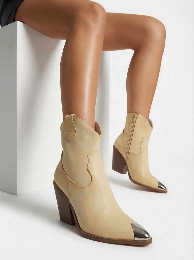 - Ковбойские ботинки на каблуке из искусственной кожи. Тканевая стелька, застежка-молния и декоративный носок. Подходят для многих женских стилей!