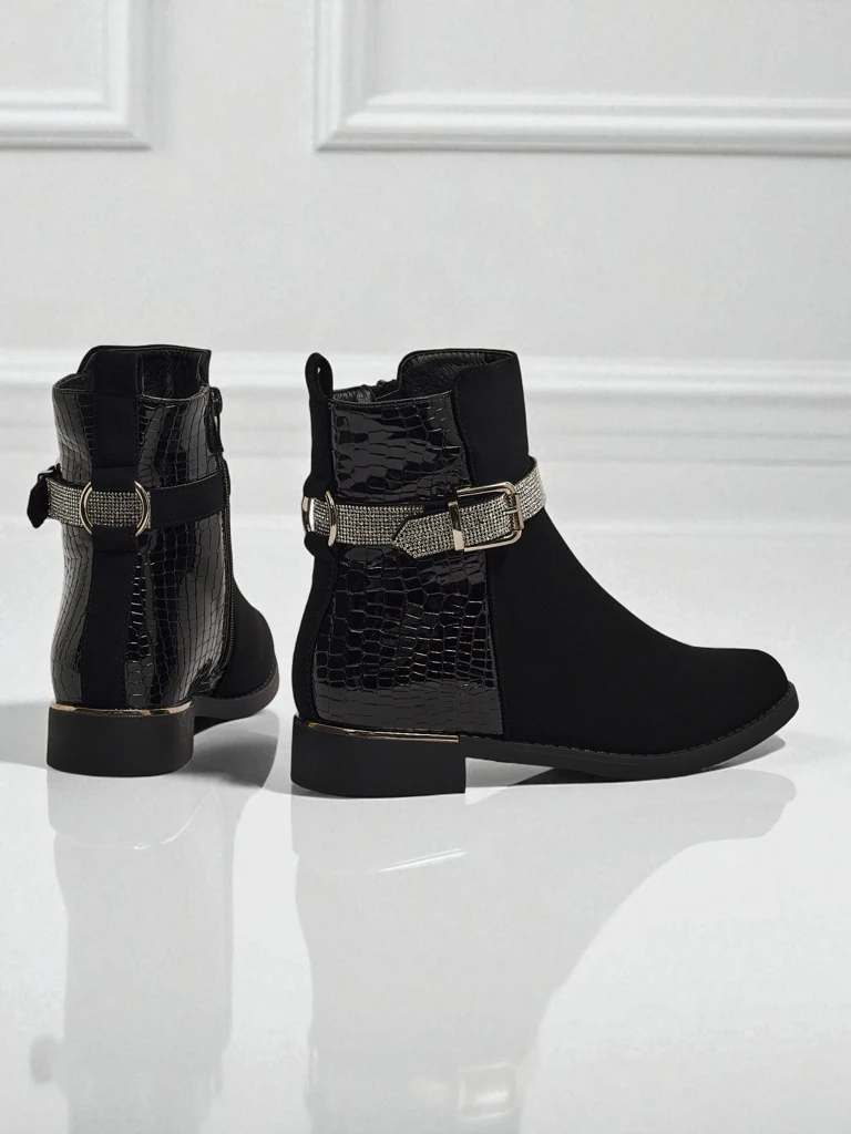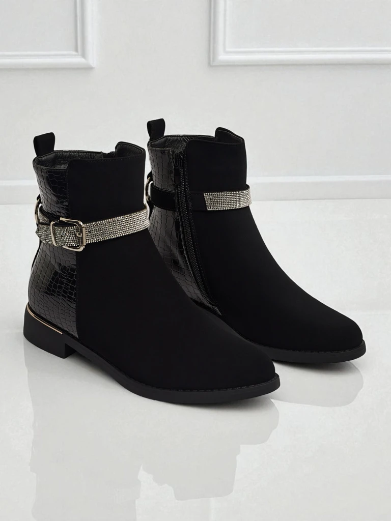 - Женские ботинки на молнии. Модель выполнена из комбинации матовой и лакированной экокожи, на плоской подошве. Имеют утеплитель а-ля мех. Украшены цирконами. Удобные и стильные, идеально подходят для осени!