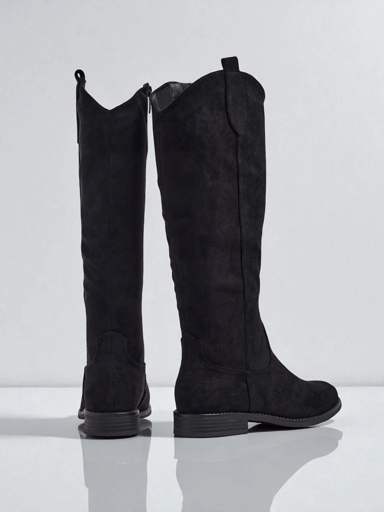 - Стильные женские сапоги до колена на плоской подошве. Голенище выполнено из эко-замши, внутри утепление в виде меха. Модель застегивается на молнию. Идеально подходят для повседневных осенних образов!