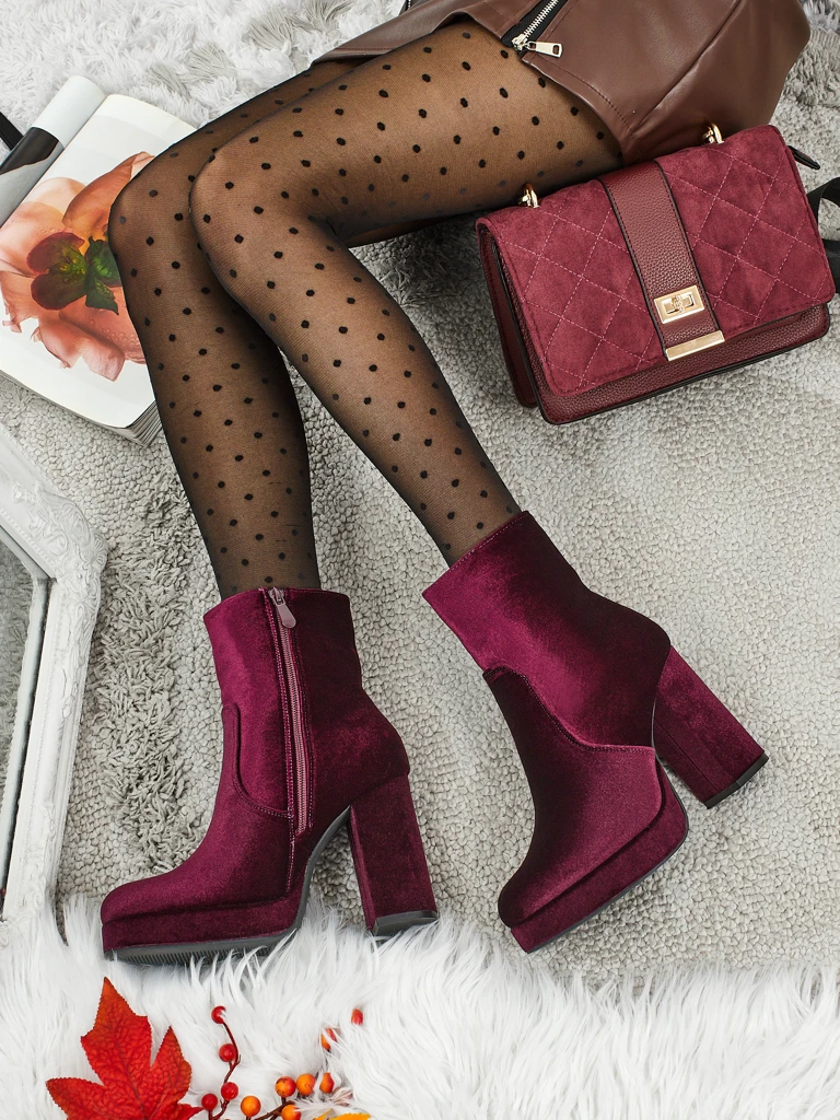 - Удобные ботильоны на каблуке-столбике, выполненные из ткани под велюр. Модель застегивается на молнию. Имеет деликатное утепление в виде меха. Идеальный выбор на осень!