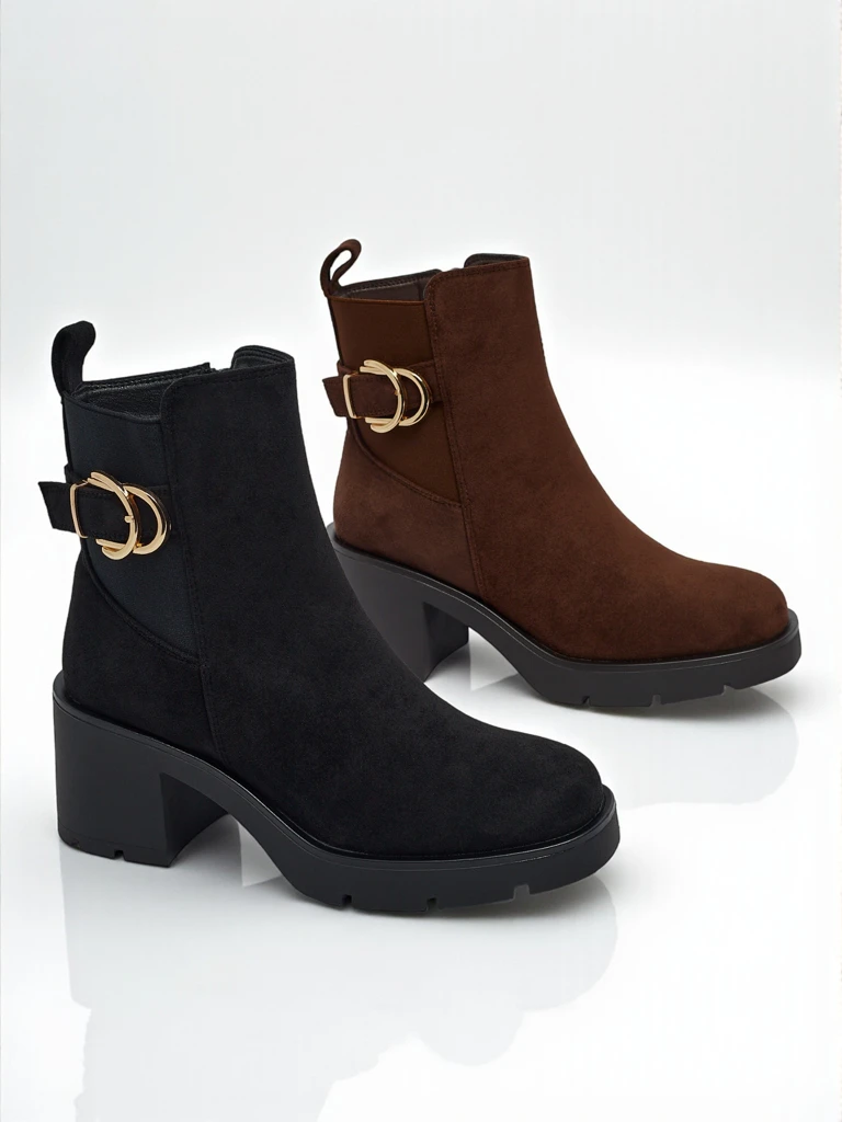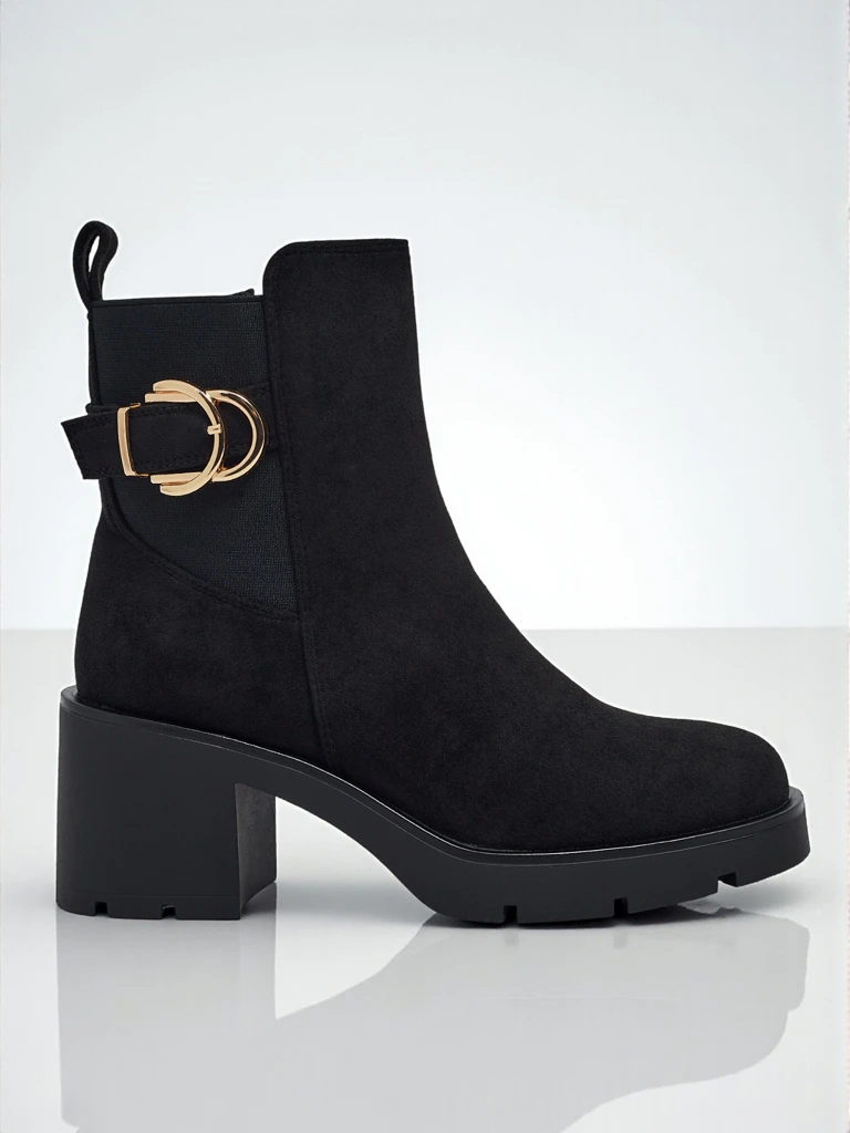 • Удобные ботильоны на каблуке-столбике, выполненные из эко-замши. Модель застегивается на молнию. Модель слегка утеплена мехом, имеет золотое украшение сбоку голенища. Идеальный выбор на осень!