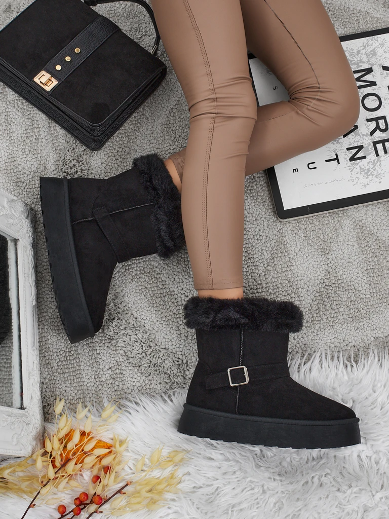 - Отличные женские зимние ботинки-снегоходы на толстой подошве. Верх выполнен из замшевой экокожи, внутренняя часть утеплена мехом. Идеальная база для зимы!