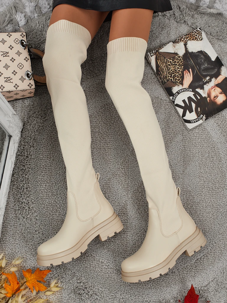 - Stylowe damskie kozaki za kolano na płaskim obcasie. Cholewka wykonana jest z elastycznego materiału tkaninowego ze wstawkami z eko skóry, w środku tkaninowa wkładka. Model wsuwany. Idealne do codziennych jesiennych outfitów!