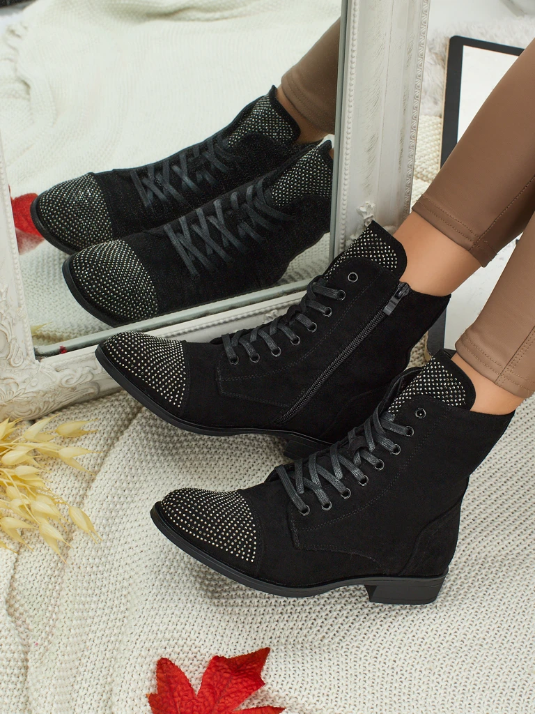 - Женские ботинки из эко-замши с молнией, шнуровкой и круглым носком, дополнительно утепленные мехом - современность, удобство и стиль в одном. Передняя часть голенища украшена цирконами.