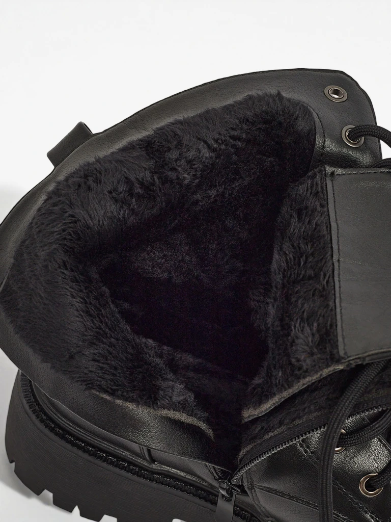 • Женские ботинки-ботильоны в стиле «рабочих» — это уникальная обувь, сочетающая в себе стиль и комфорт. Изготовлены из экокожи, утеплены нежным мехом. Модель на шнуровке и с застежкой-молнией. Толстая подошва добавляет комфорта на каждом шагу.