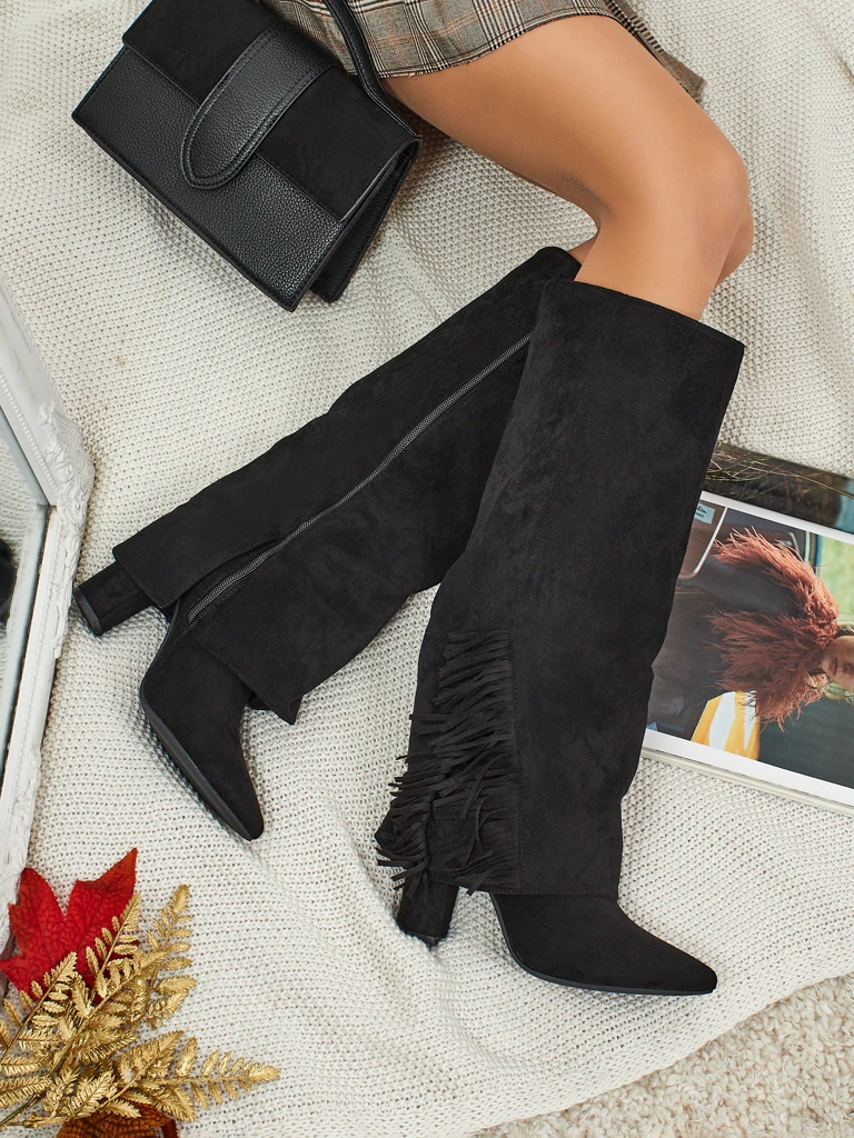 - Женские казаки на каблуке, с заостренным носком, выполнены из эко-замши и дополнены декоративным голенищем с бахромой. Обувь застегивается на молнию, утеплена внутри мехом. Подходят ко многим женским стилизациям!